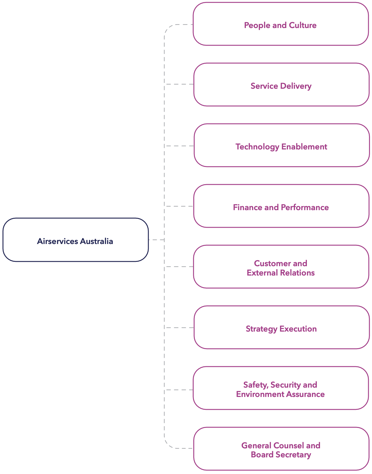The diagram below outlines our organisational structure as at 30 June 2024. Airservices did not have any subsidiaries during the 2023-24 period.