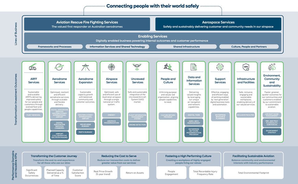 We are driving 10 transformational outcomes to deliver the aspirations for our 3 lines of business — Aerospace Services, Aviation Rescue Fire Fighting Services and Enabling Services — as we connect people with their world safely.