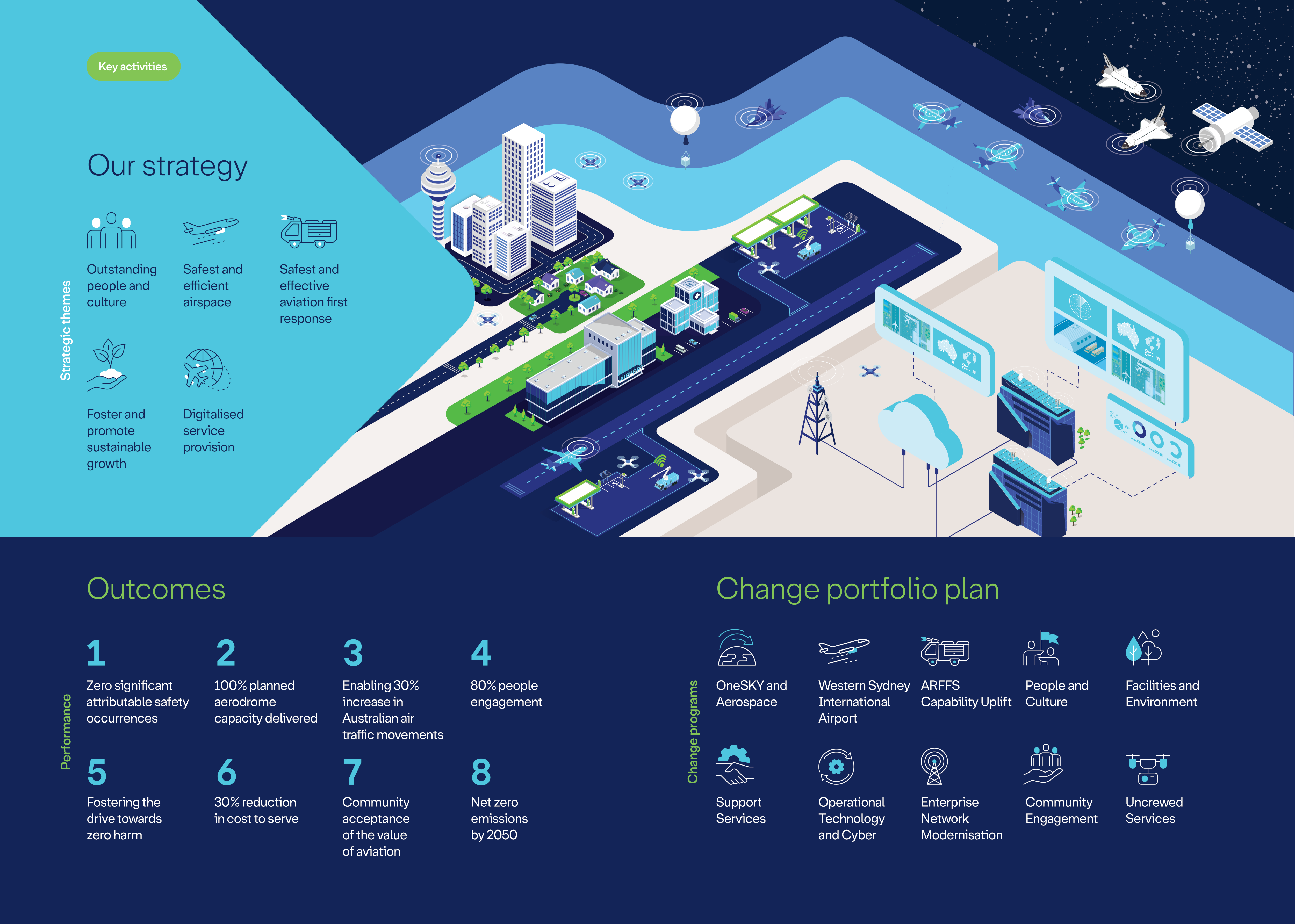 Transform our operations to be more resilient, clean and reliable to provide better outcomes for our communities through innovative designs, intelligent systems and best practice community engagement. Increase the capacity at our aerodromes to help drive the next 30 years of Australian economic growth, enabling an additional 73 million passenger movements per year.